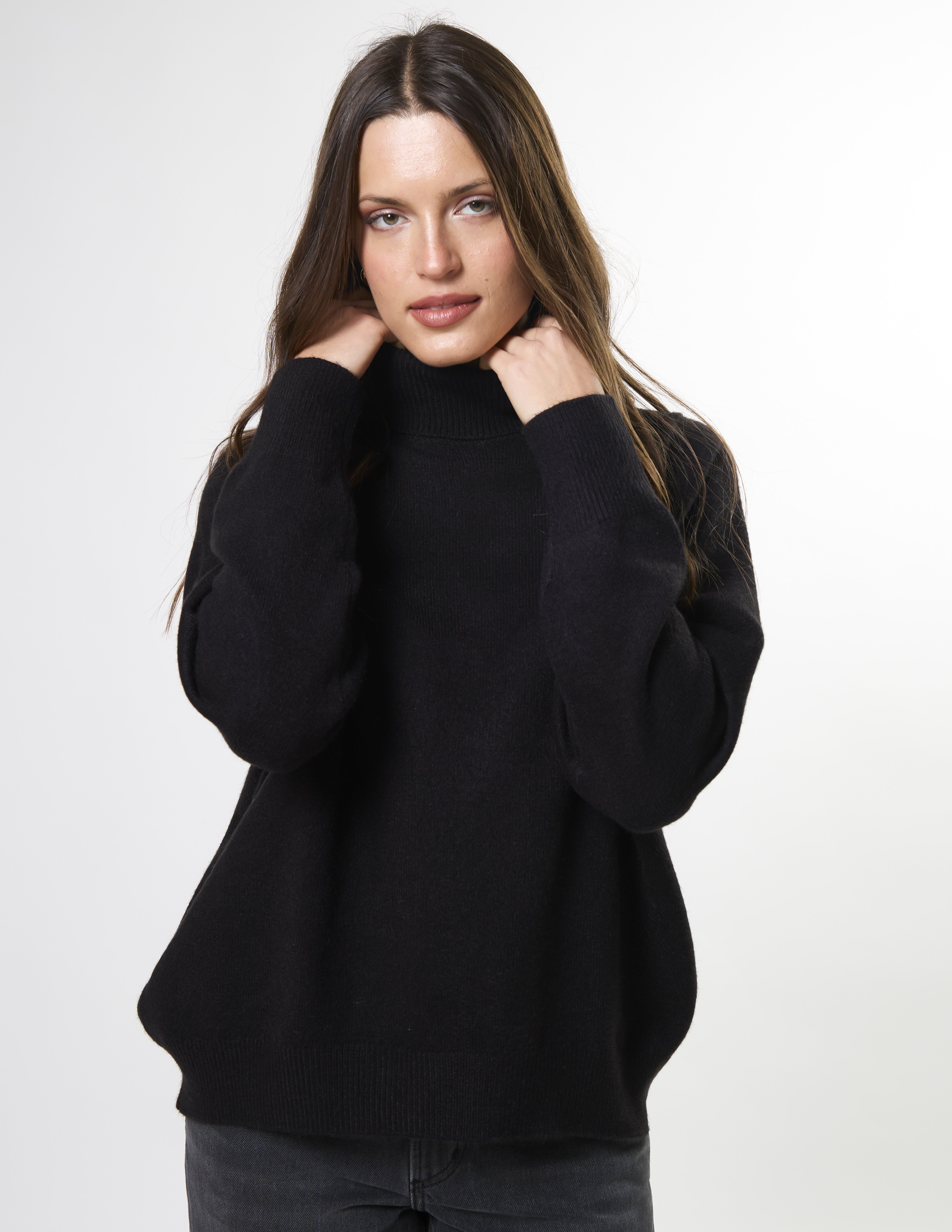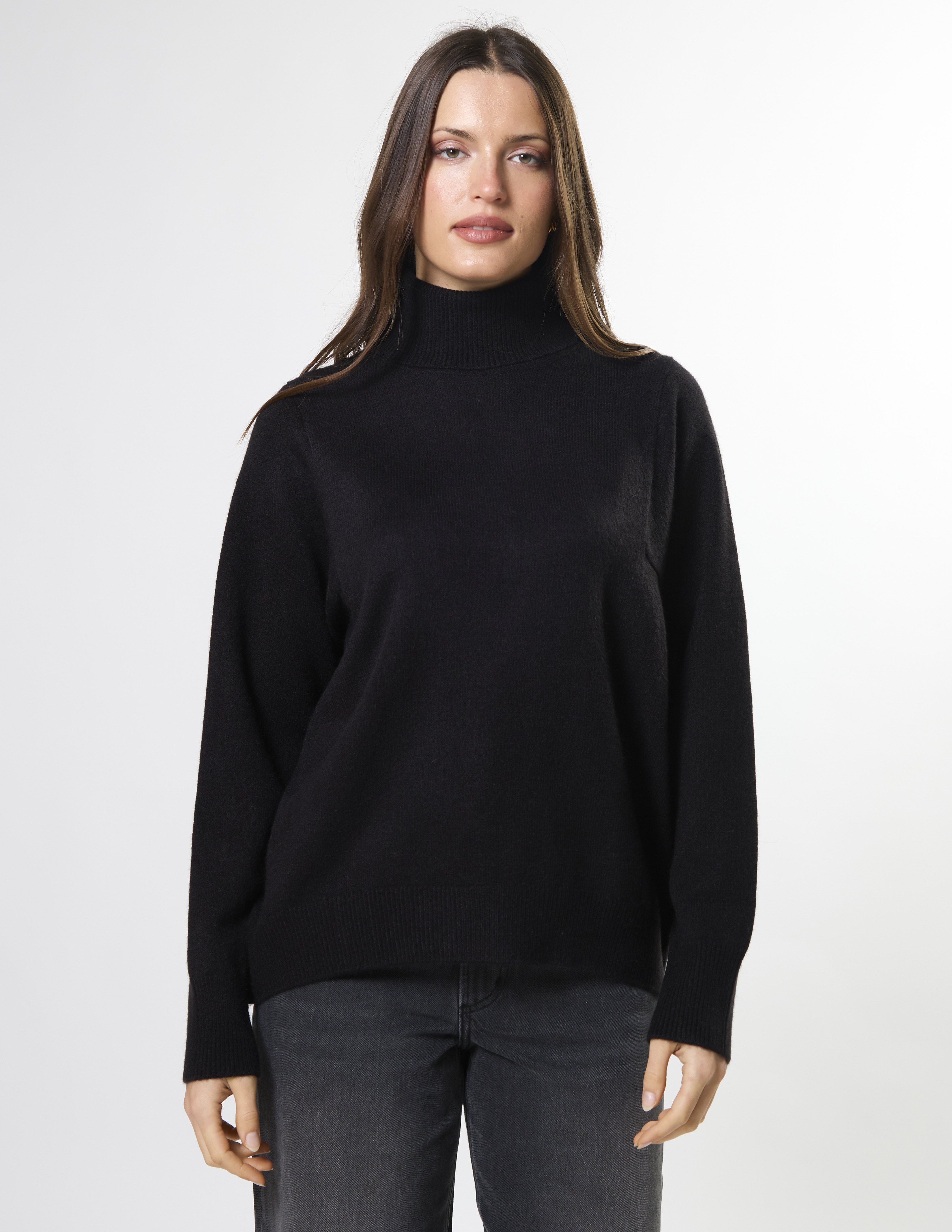 Saddle shoulder knit with roll neck and fashioned neckline, ribbed cuffs and hem and hi lo curved hem shaping.