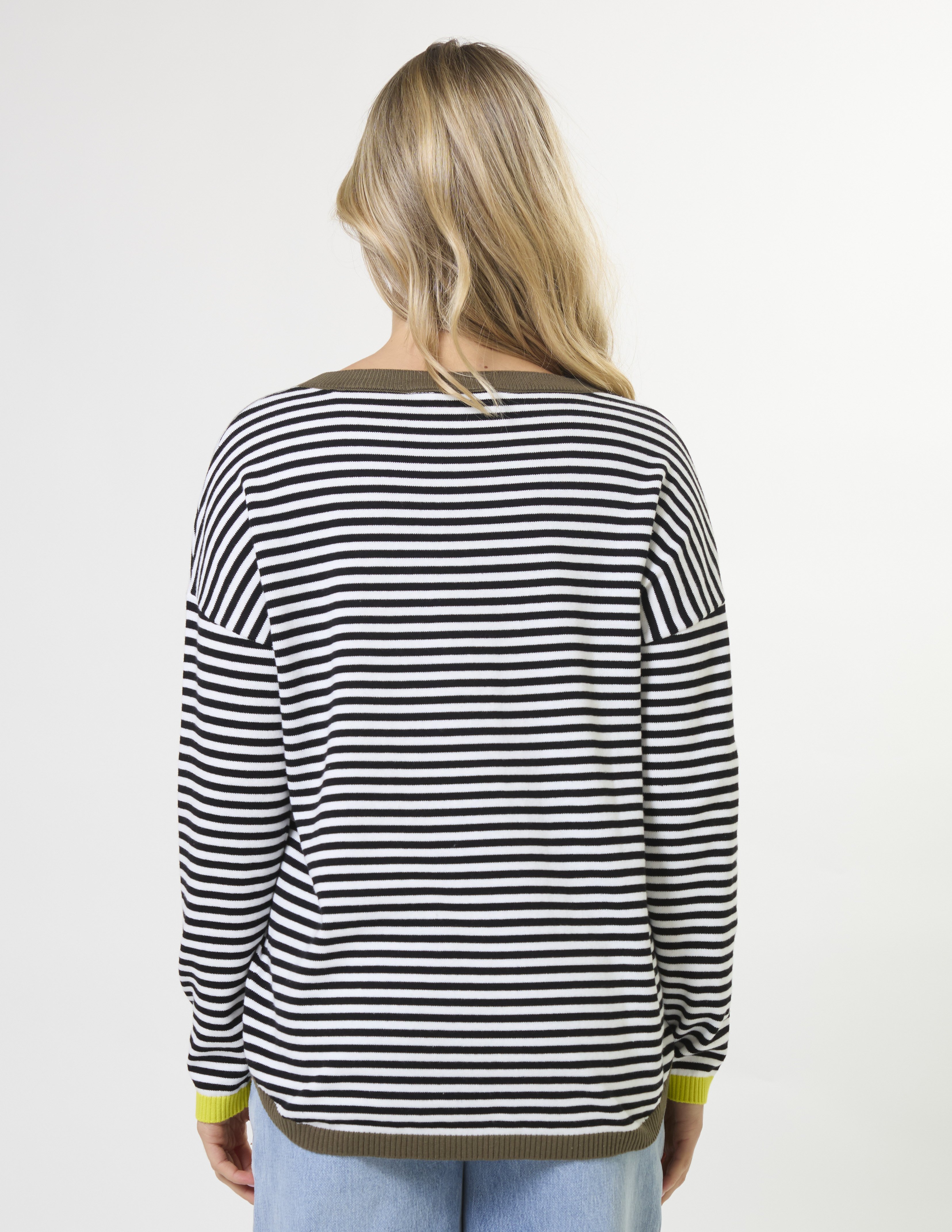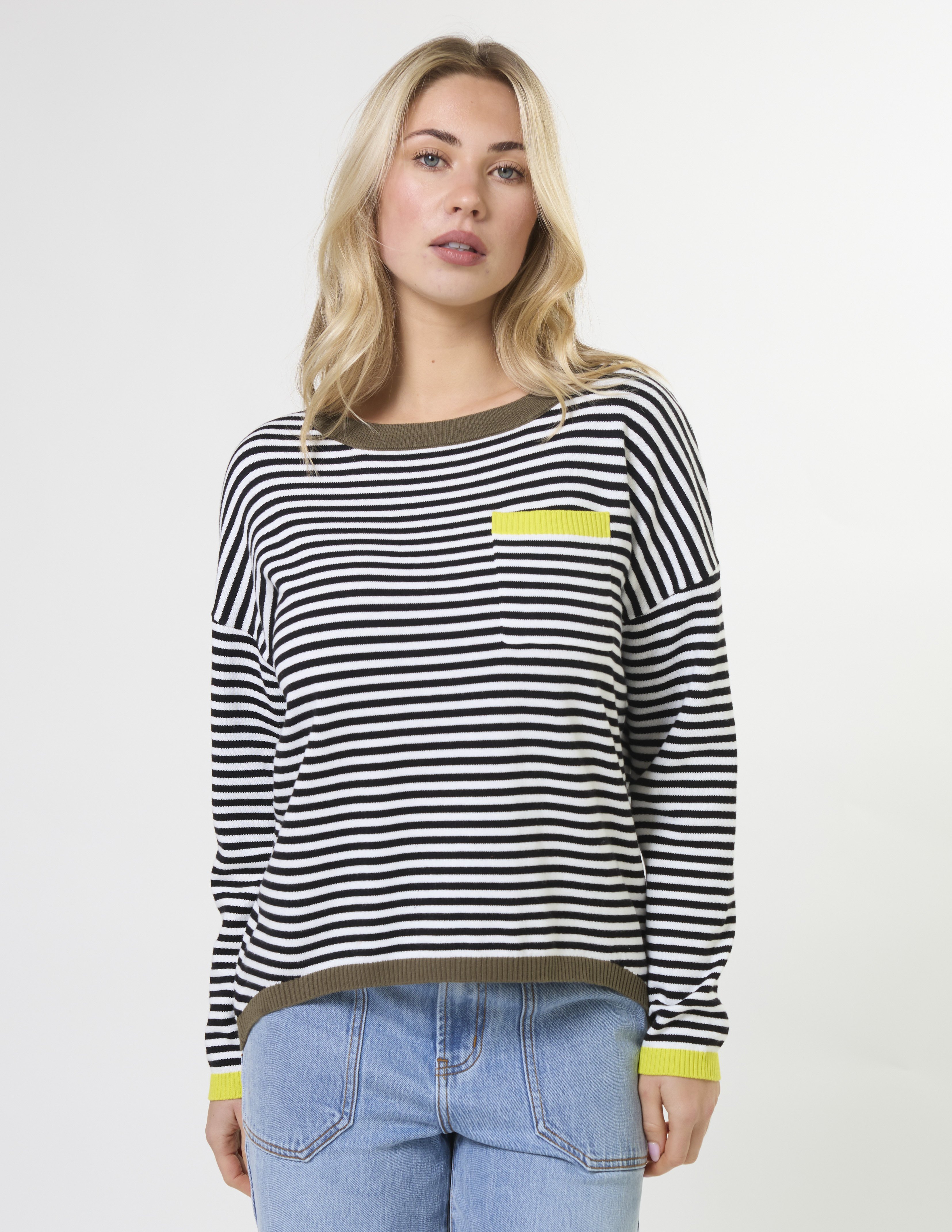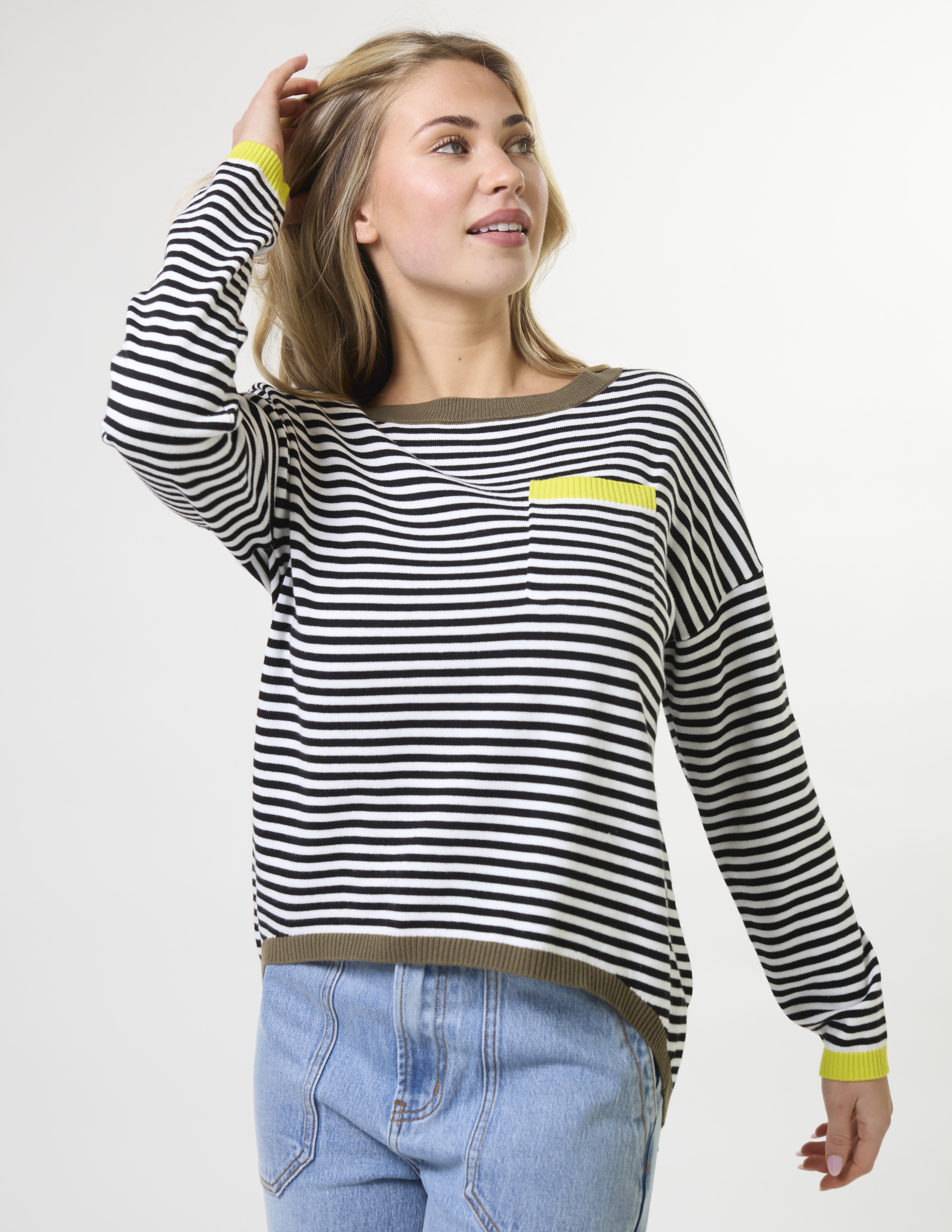 Striped lightweight jersey knit with contrast colour trims. Crew neck, chest pocket, dropped shoulder and slightly hi lo hemline.