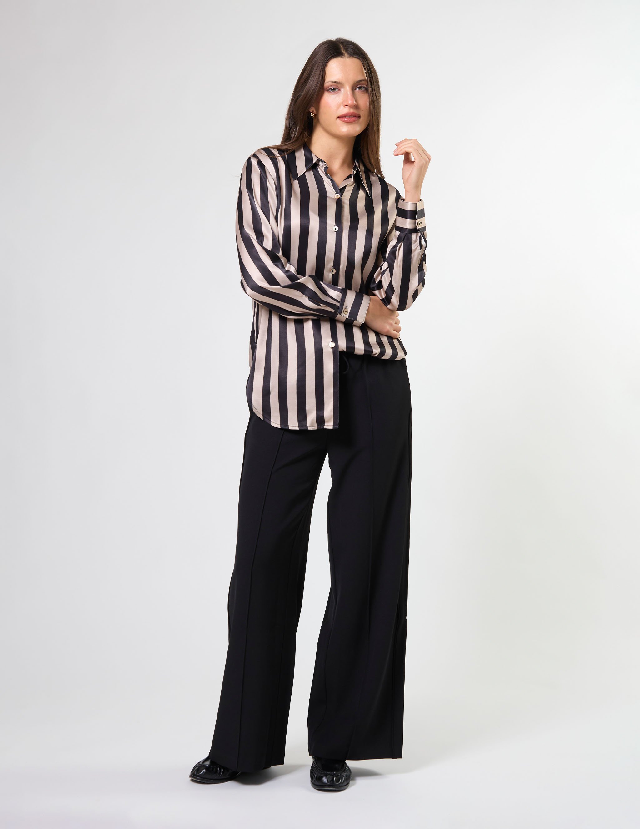 Relaxed fit satin striped blouse with button front, collar and curved hemline.