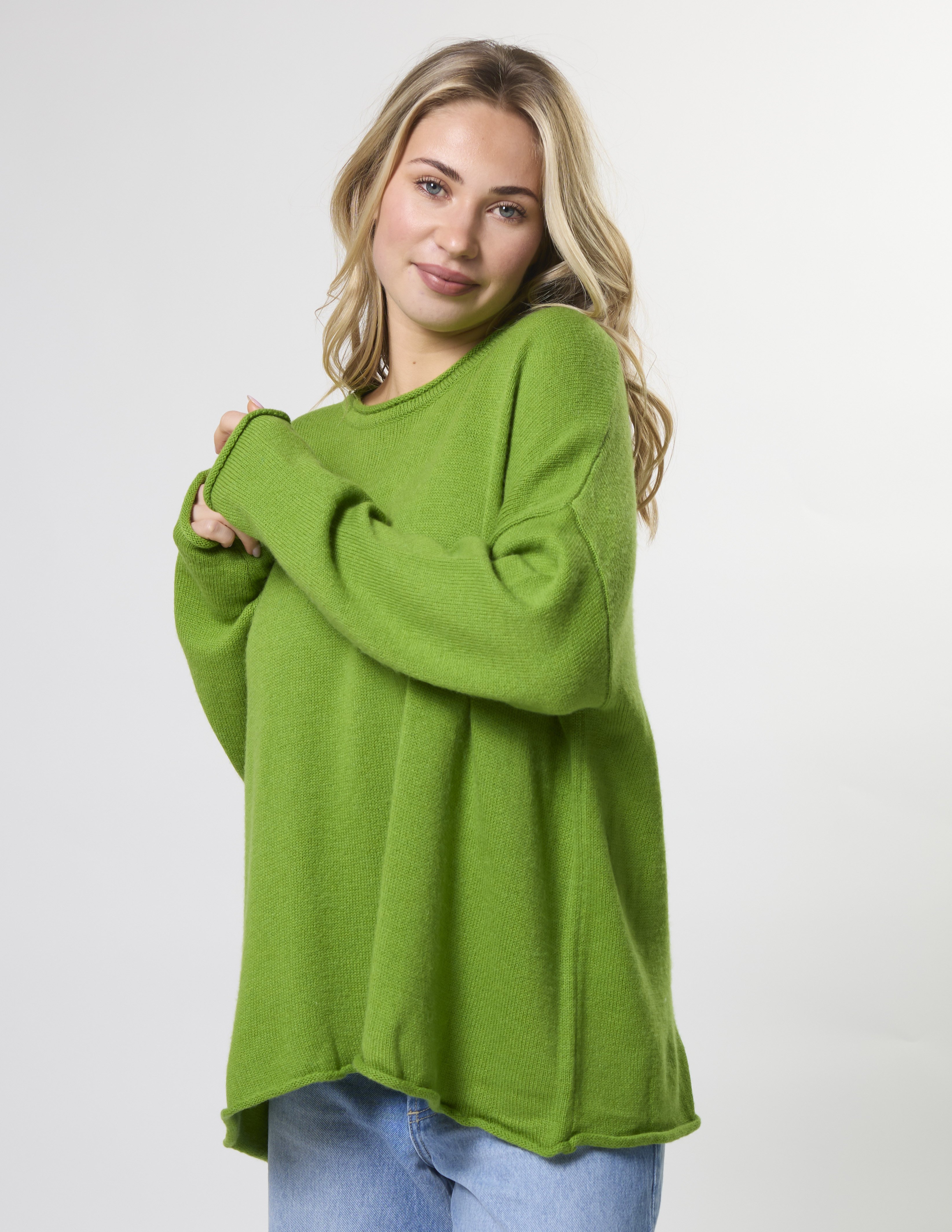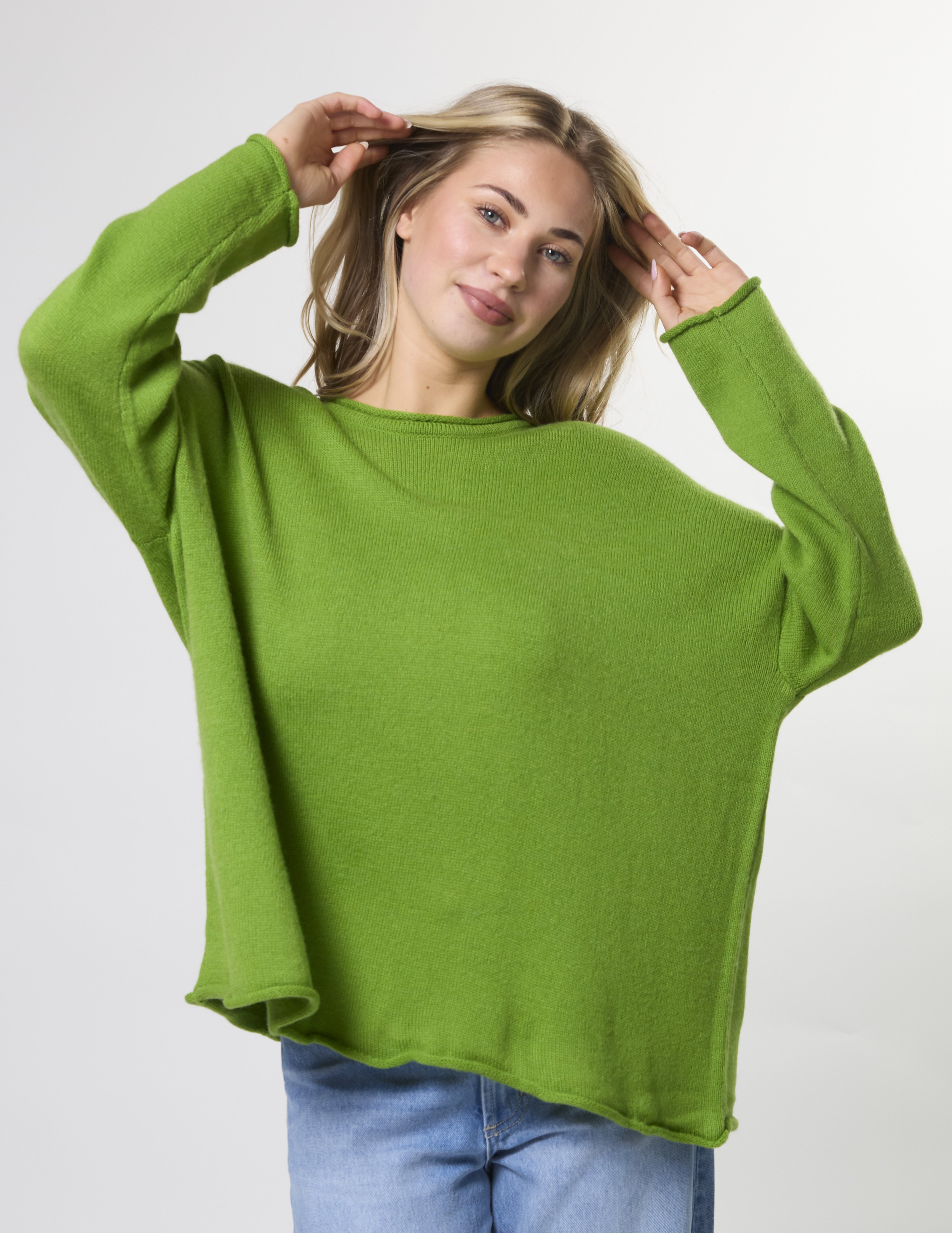 One size relaxed fit knit with crew neck, dropped shoulder and rolled edges on the neckline, cuffs and hem.