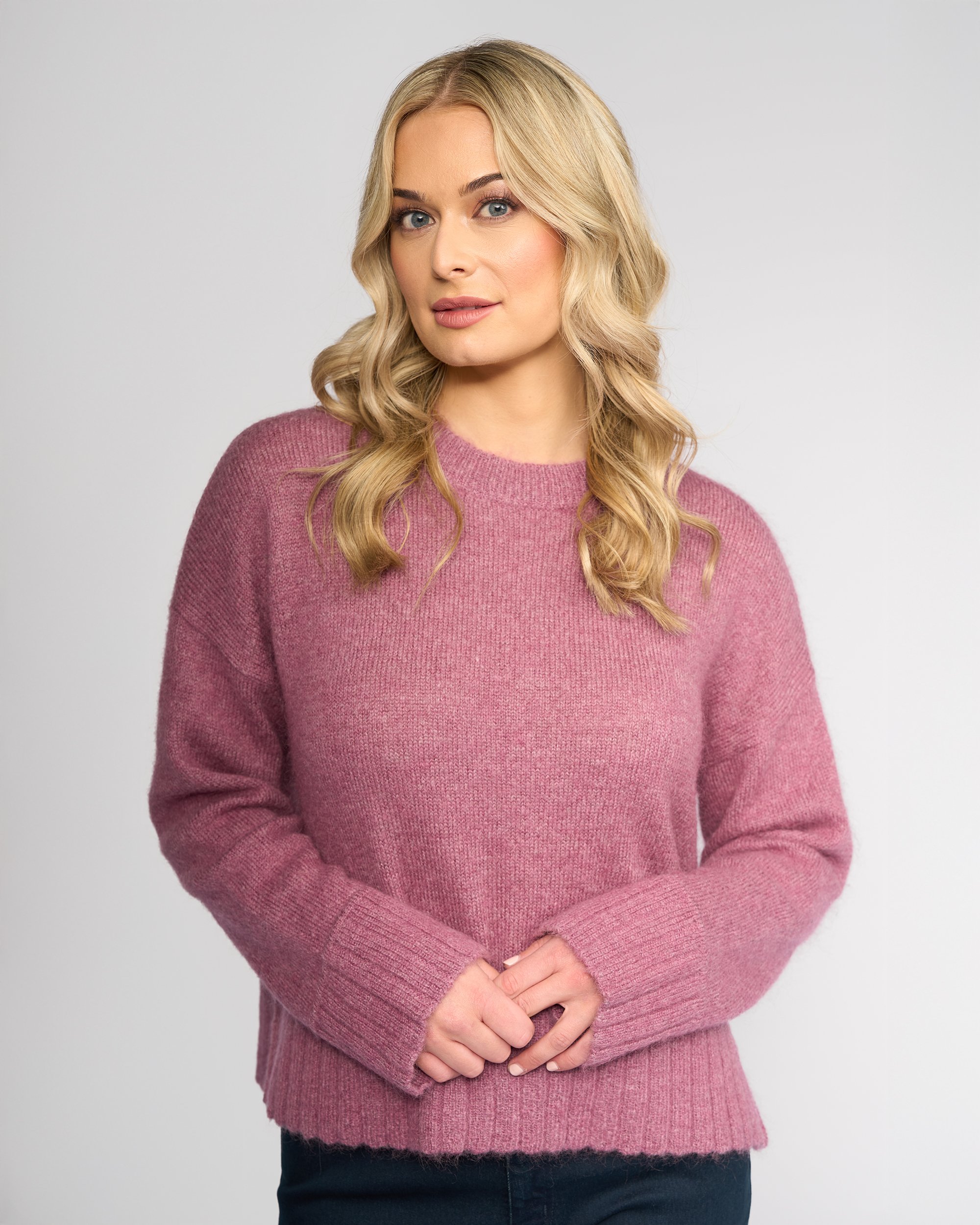 A soft, cosy sweater perfect for layering. Designed with a relaxed fit and drop-shoulder sleeves, this style features a high-low hem with side splits, and ribbed detailing at the neckline, cuffs, and hem. Knitted with a blend that includes wool and mohair for warmth.