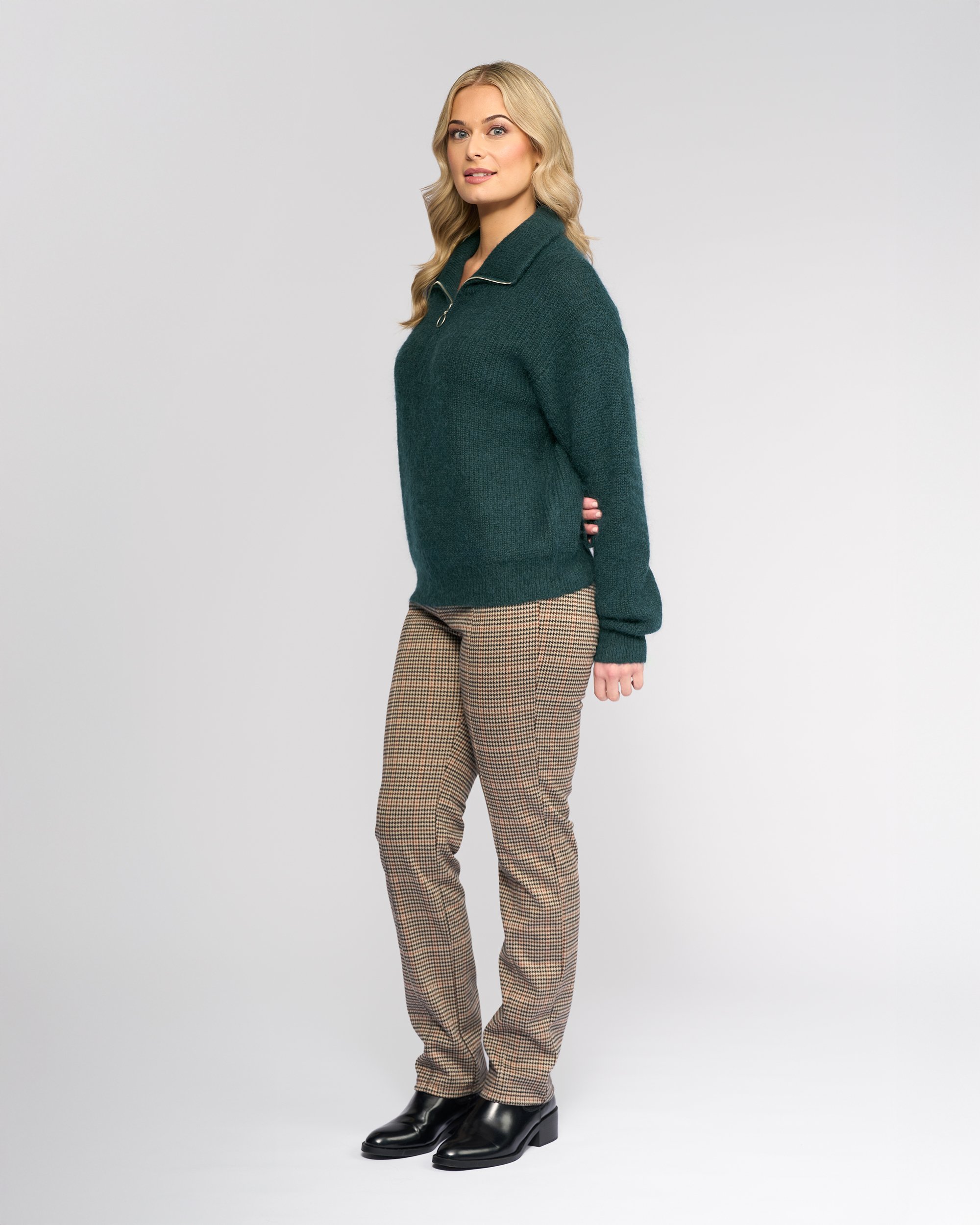A half zip sweater in our Mallard colour — a deep, luxurious green with a soft blend that includes mohair and wool for added warmth and texture. Designed with a wide collar and a metal half zip with round puller, this chunky rib knit has a loose, easy fit perfect for layering.