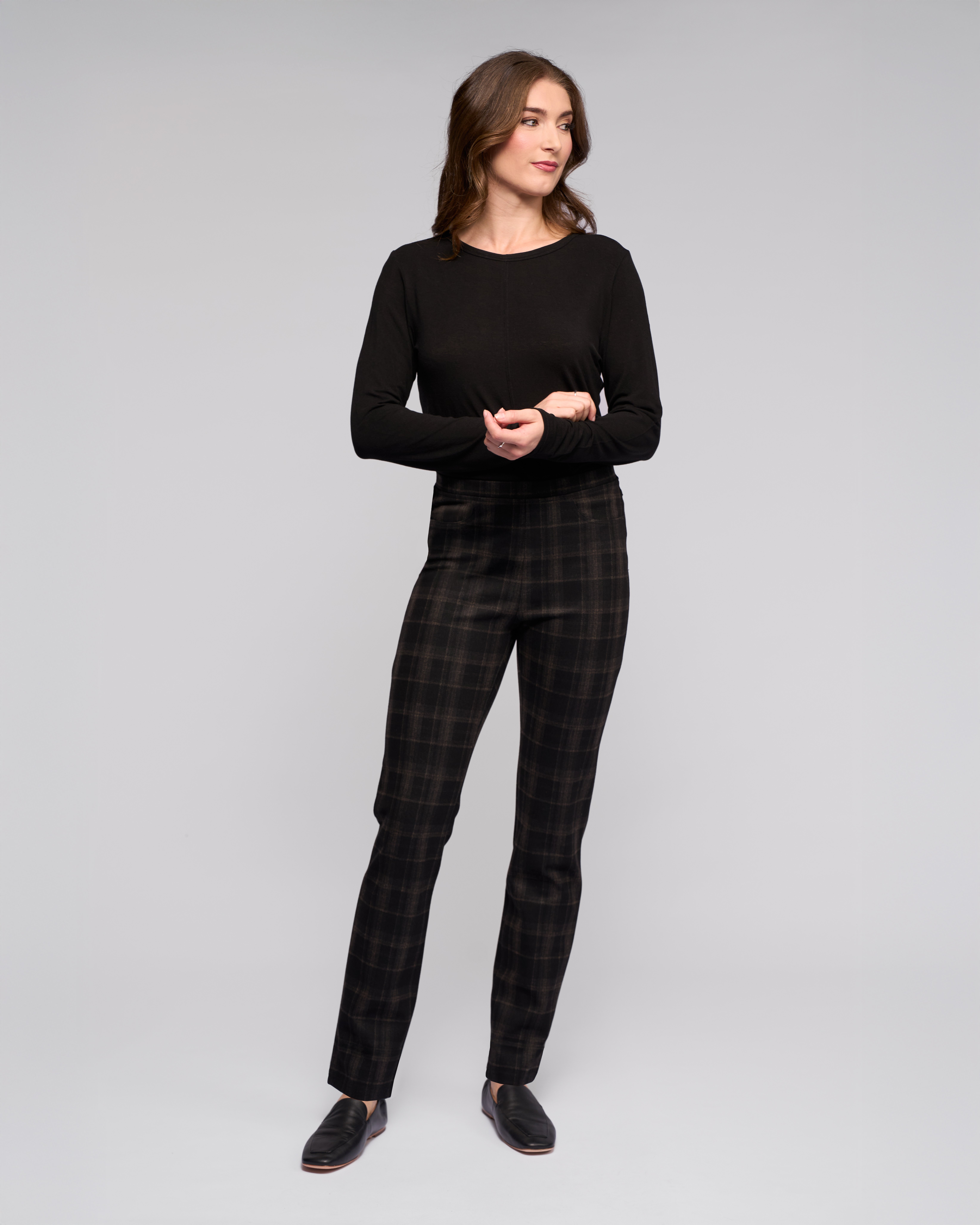 Full-length slim pant in stretch ponti fabric. This easy pull-on style features an elasticated waistband for a comfortable fit, finished with refined detailing including a faux fly, faux front pockets, and back patch pockets.