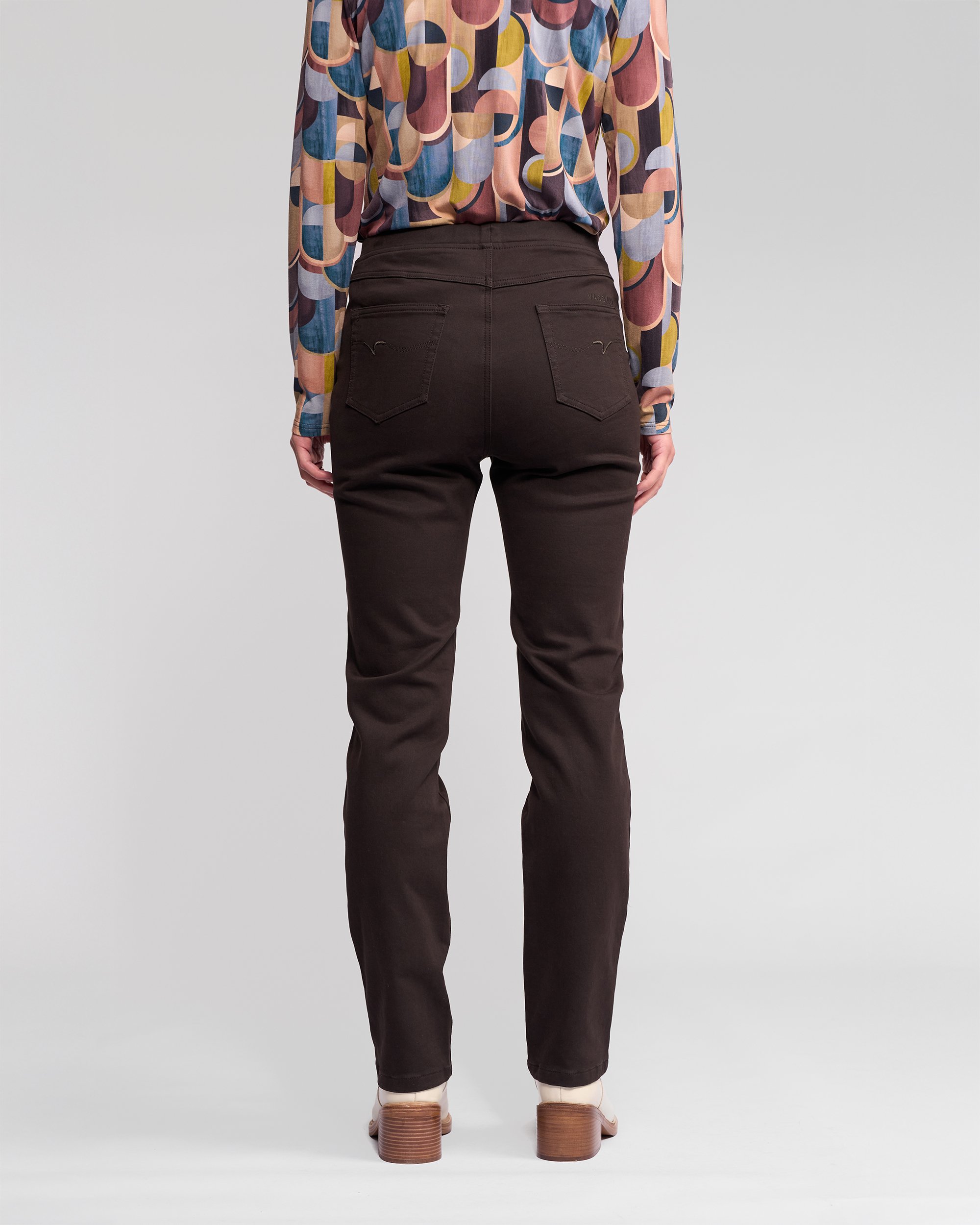 Full-length slim pant, made from a soft moleskin-inspired stretch fabric with a lightly brushed finish for a smooth, refined feel. Designed in an easy pull-on style with an elasticated waistband, this pant offers a comfortable, flattering fit and is finished with classic denim-inspired details including a faux fly, faux front pockets, and back patch pockets.