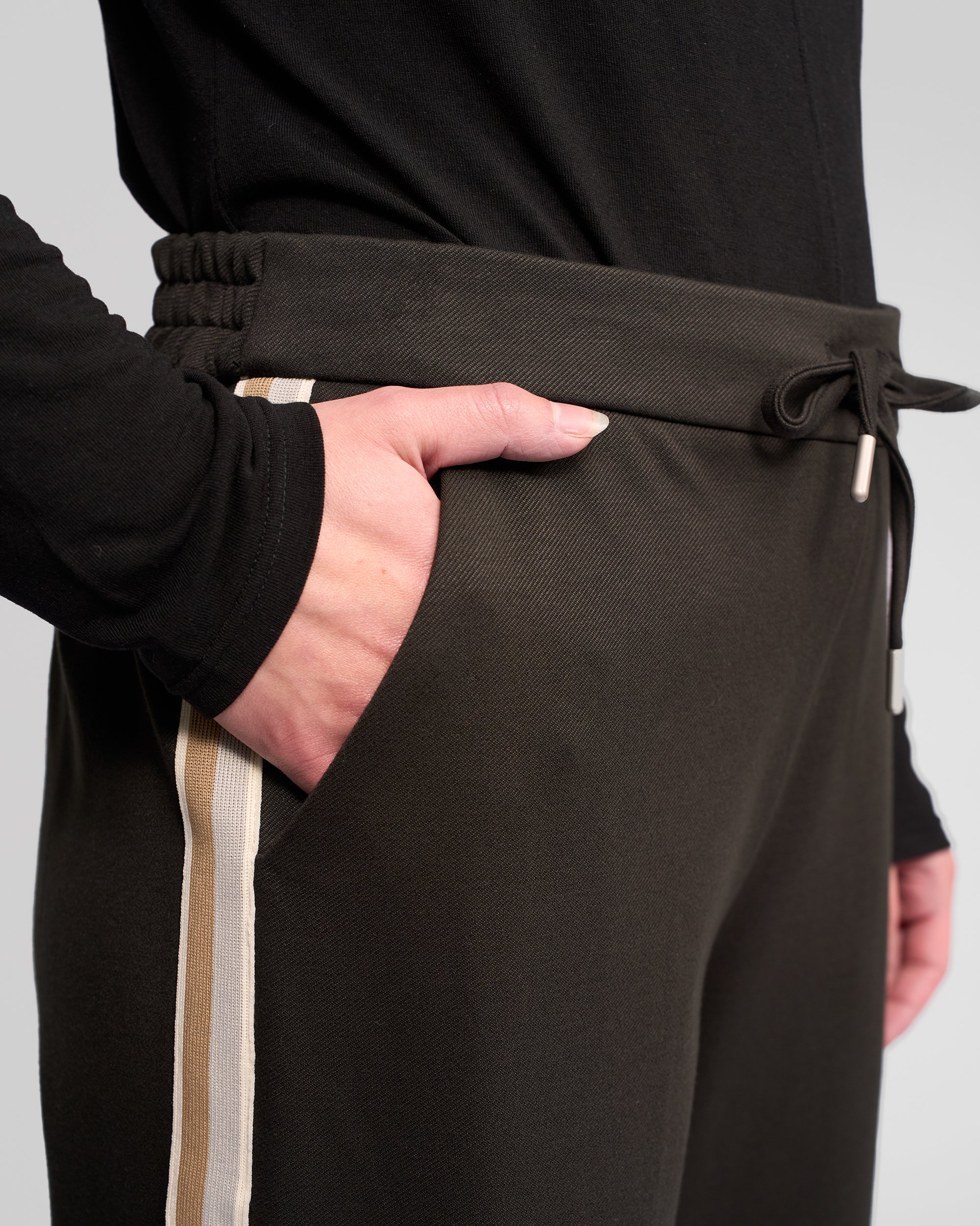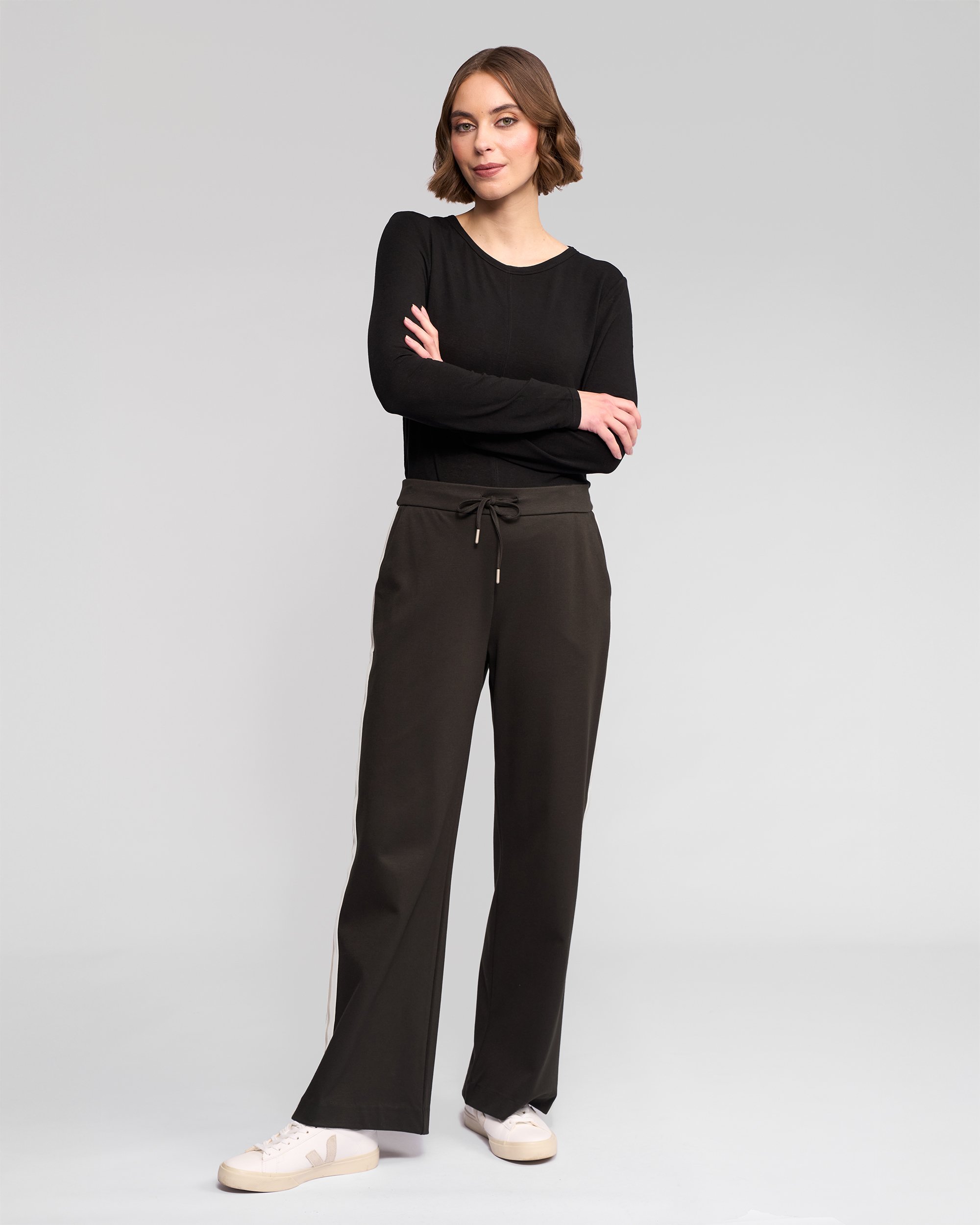 Wide-leg full-length track pant with contrast side stripe detailing. Designed in a comfortable stretch fabric, this style features an easy elasticated waist with adjustable drawstring for everyday wear. A relaxed yet polished take on a classic track pant, complete the set with the matching Weekend Knit Jacket.