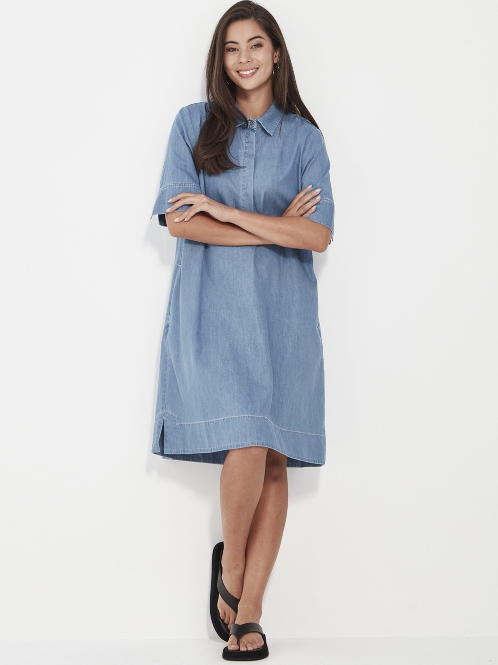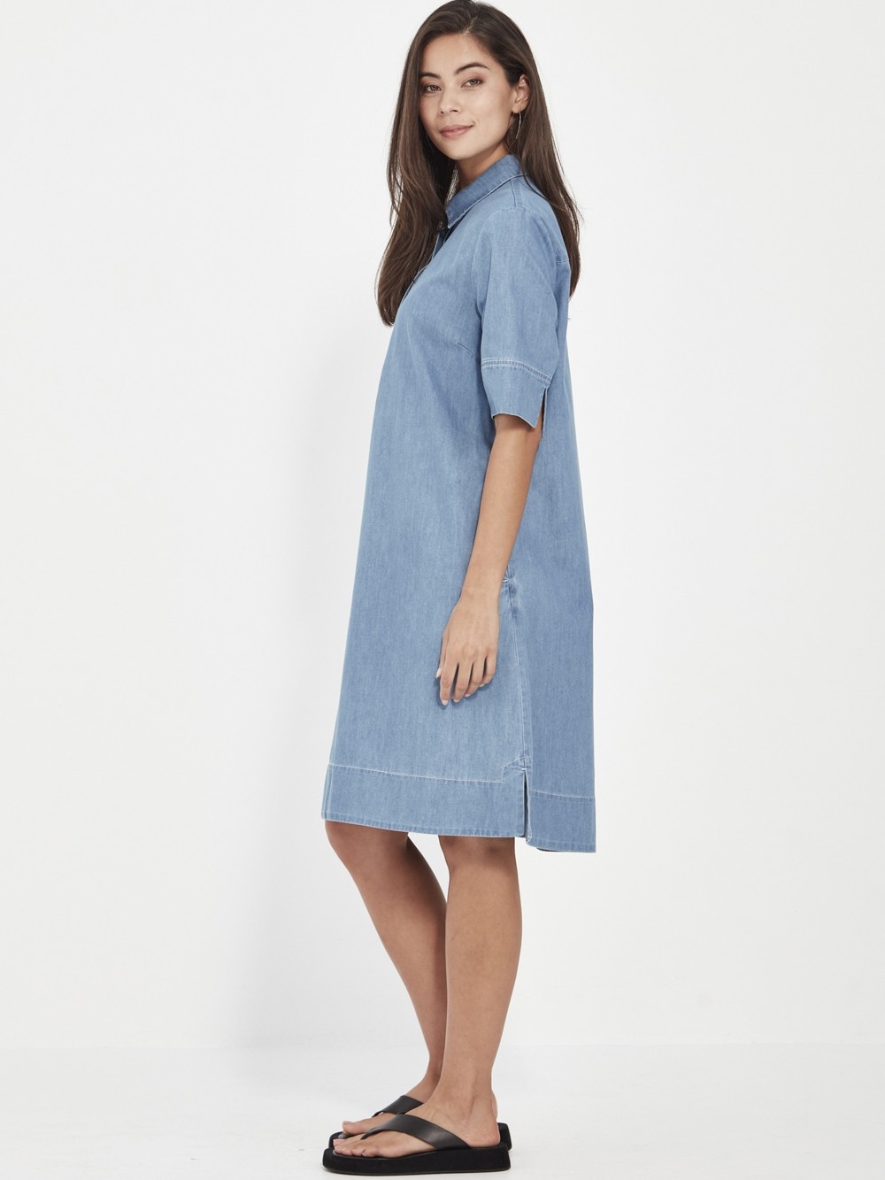 The Alex Dress is a relaxed yet refined shift silhouette crafted from soft-washed chambray denim. It features a stand collar, half-placket front, and elbow-length straight sleeves finished with split cuffs. An inverted pleat at the back adds ease of movement, while side pockets enhance functionality. Effortlessly stylish and endlessly wearable, it’s a timeless design that flatters all body shapes.