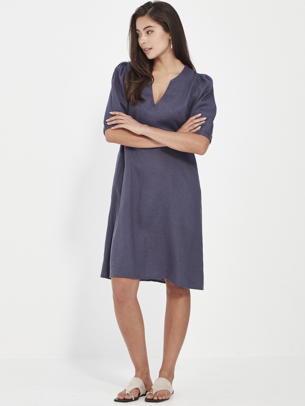 The Becky Dress is a breezy shift silhouette crafted in 100% linen—lightweight, breathable, and perfect for warmer days. Falling to just above the knee, it features a flattering scoop V-neckline and voluminous elbow-length sleeves with elasticated cuffs for a soft, gathered finish. Stitched side pockets add practical charm, while the easy fit and clean lines make it a timeless piece you'll reach for again and again.