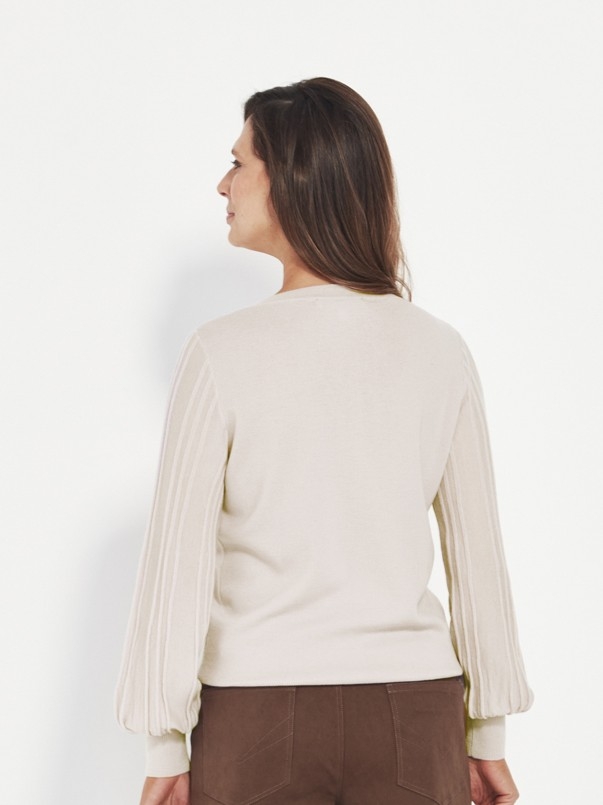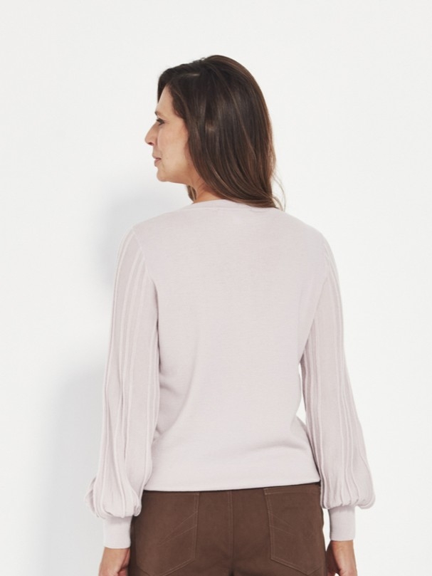 The Nina Sweater is crafted from 100% Merino, offering natural softness, warmth, and a beautifully smooth drape. A refined V-neckline frames the face, while the pleated bell-shaped sleeves create a striking, feminine silhouette. The dramatic shape is anchored by a deep rib cuff, giving the sleeve its distinctive sculptural volume.